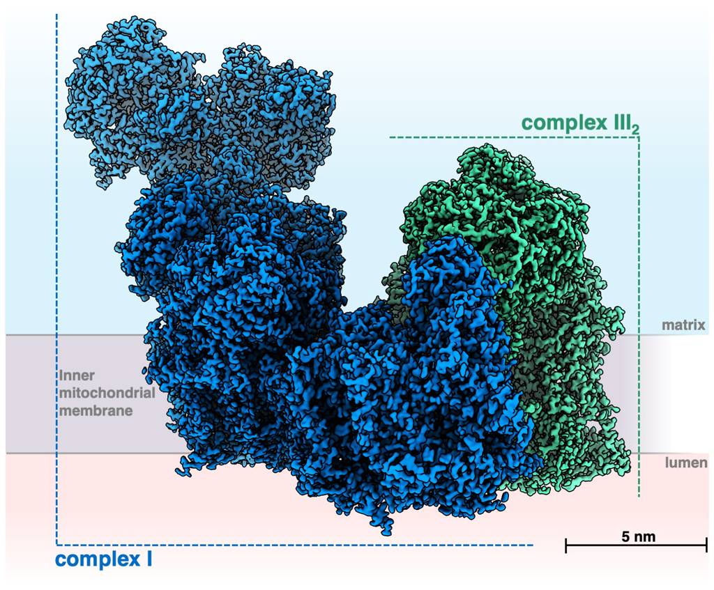 Im Zuge der Zellatmung überträgt er Elektronen zwischen chemischen Substraten und nutzt die dabei verfügbar werdende Energie, um geladene Wasserstoffionen, sogenannte Protonen, über die innere Mitochondrienmembran zu verschieben. Im Resultat wird eine Ladungstrennung bewirkt, ganz analog zu den Verhältnissen in einer Batterie. Diese Ladung kann nachfolgend eingesetzt werden, um die energiereiche chemische Verbindung Adenosintriphosphat (ATP) zu bilden. Doch welche genauen Wege durchlaufen die Protonen innerhalb des Superkomplexes? Die ermittelte Struktur des Superkomplexes gibt hier erste Antworten. So konnten, bedingt durch die außergewöhnliche Genauigkeit der Struktur, zahlreiche Wassermoleküle innerhalb des Superkomplexes gefunden werden, die auf die Ausbildung winziger Wasserkanäle hindeuten. Wie das Öffnen und Schließen dieser Kanäle reguliert wird, muss allerdings noch weiter untersucht werden.