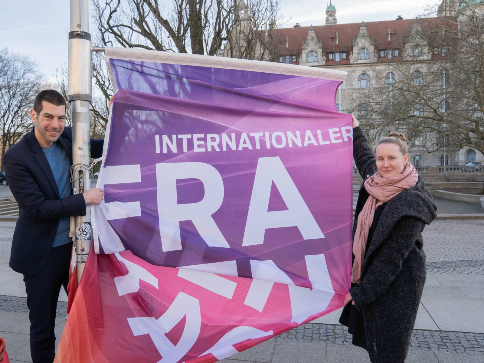 Der Erste Stadtrat Dr. Axel von der Ohe und die Gleichstellungsbeauftragte Luisa Arndt hissen am Friedrichswall vor dem Neuen Rathaus eine Flagge für den Internationalen Frauentag am 8. März 2025.