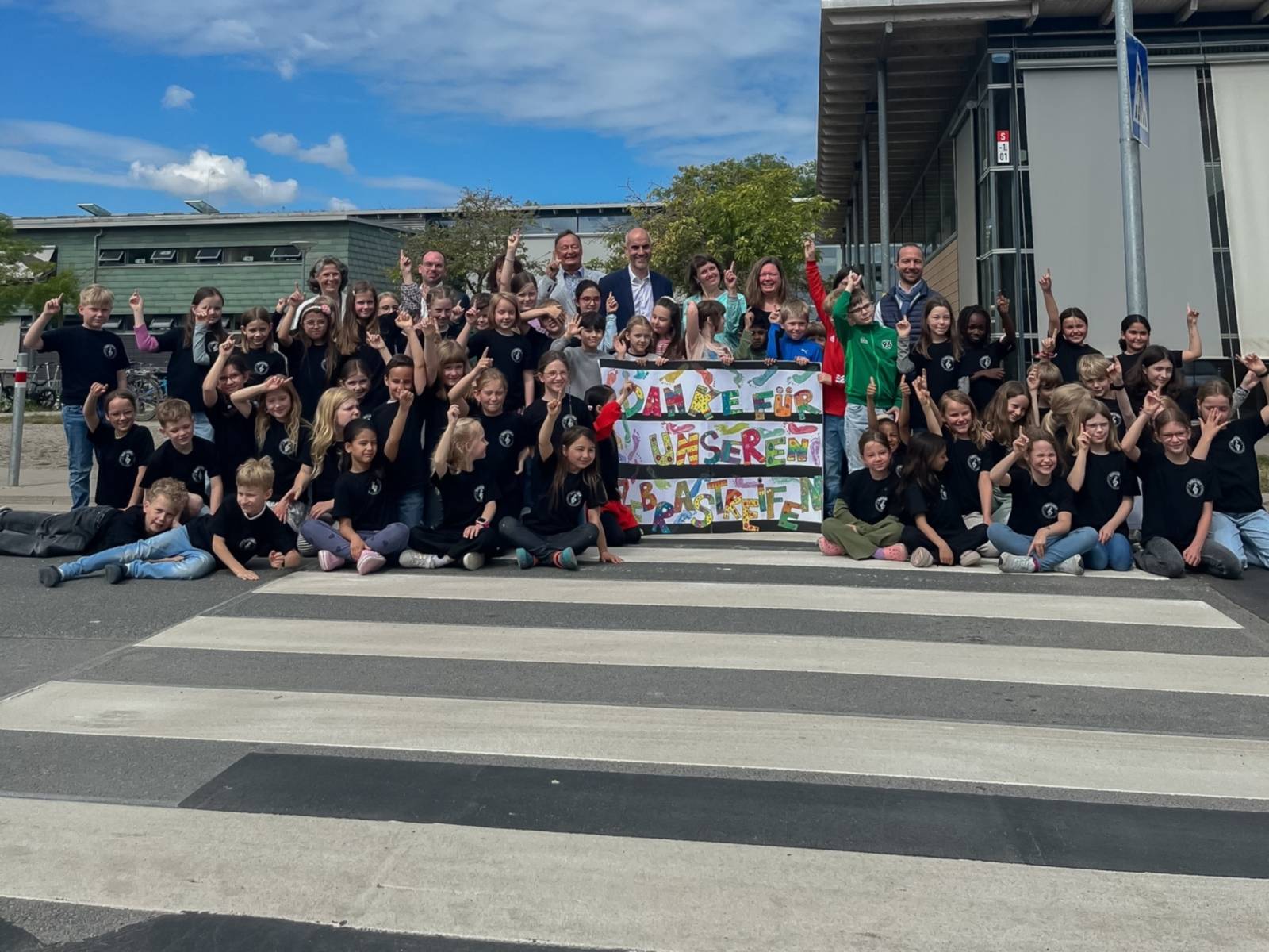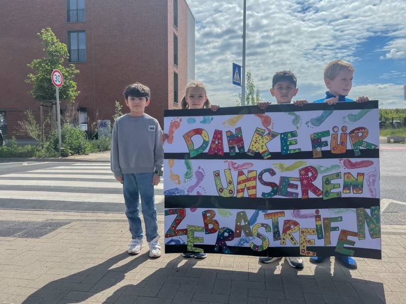 Kinder der Grundschule Feldbuschwende präsentieren das Schild "Danke für unseren Zebrastreifen" vor ihrer Schule.