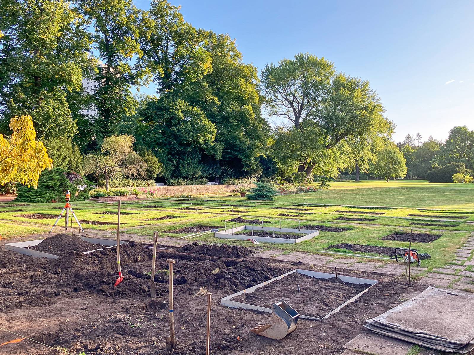 Für dieses Vorhaben wurden ab dem 9. September die 49 Beete geräumt. Die vorhandenen aber mittlerweile verrosteten Metallrahmen werden ausgebaut und durch neue ersetzt. In der zweiten Oktoberhälfte beginnen die Gärtner*innen des Stadtparks mit den Pflanzarbeiten, die circa eine Woche dauern. Gepflanzt werden zum Beispiel Rosensorten wie „Baby Schneewittchen“, „Apfelblüte“ oder „Fräulein Maria“ und bewährte Begleitstauden wie Salbei, Lavendel oder Eisenkraut. Die Rosensorten werden nach der Pflanzung namentlich ausgeschildert.
