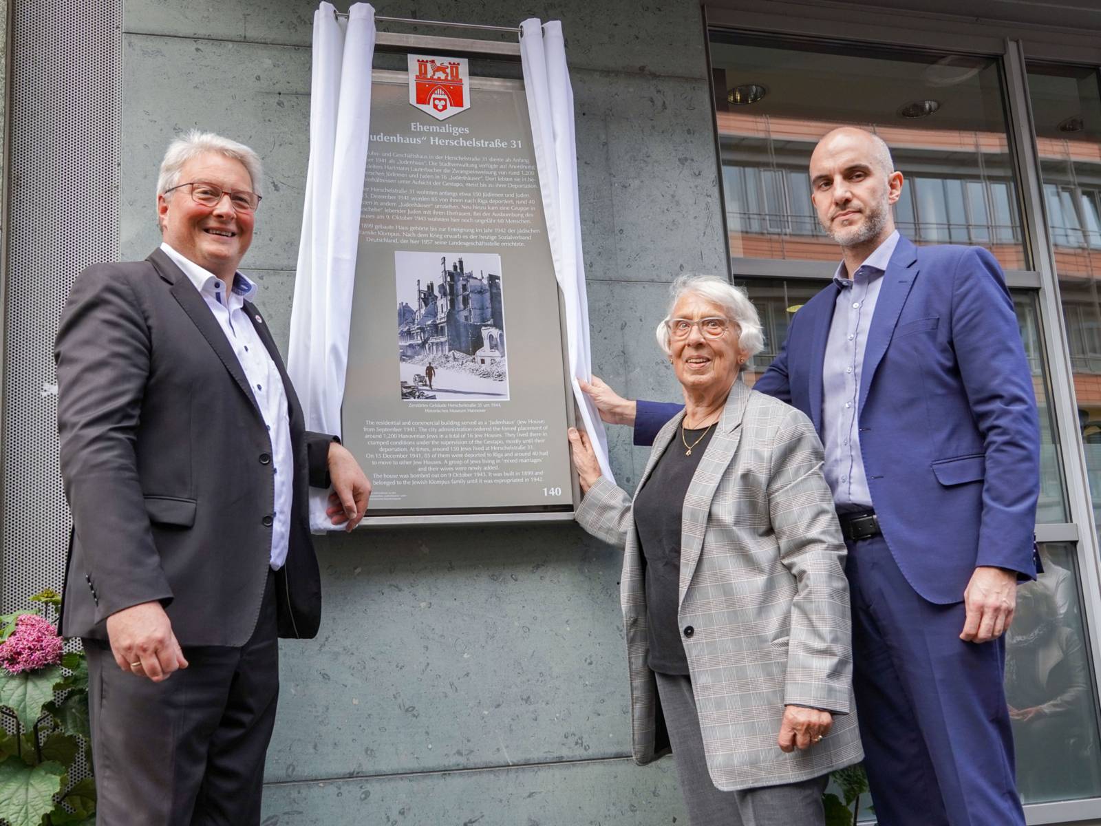 Vor 67 Jahren hat der heutige Sozialverband Deutschland (SoVD) in der Herschelstraße 31 in Hannover seine Landesgeschäftsstelle errichtet. Erst viele Jahrzehnte später erfuhr er, dass sich während des nationalsozialistischen Regimes von 1941 bis 1943 ein sogenanntes „Judenhaus“ auf dem Grundstück befand. Im Rahmen einer Veranstaltung am Mittwoch, 9. Oktober, enthüllten der SoVD-Vorstandsvorsitzende Dirk Swinke und Hannovers Oberbürgermeister Belit Onay gemeinsam eine Stadttafel zum Gedenken an das ehemalige „Judenhaus“ und seine Bewohner*innen.