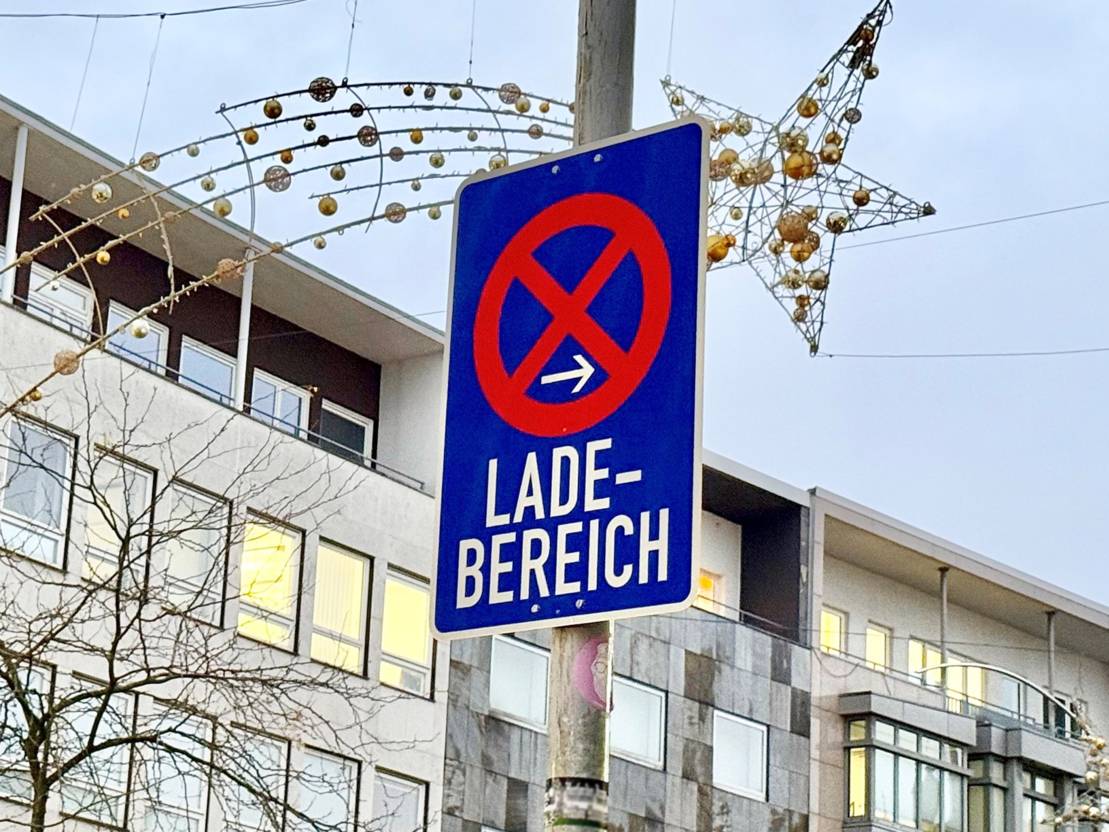 Blauer Hintergrund, roter doppelt durchgestrichener Kreis und der Zusatz „Ladebereich“ – so sieht das neue Verkehrszeichen 230 aus. Es befindet sich in der Karmarschstraße 32/34 und umfasst drei Stellplätze.
