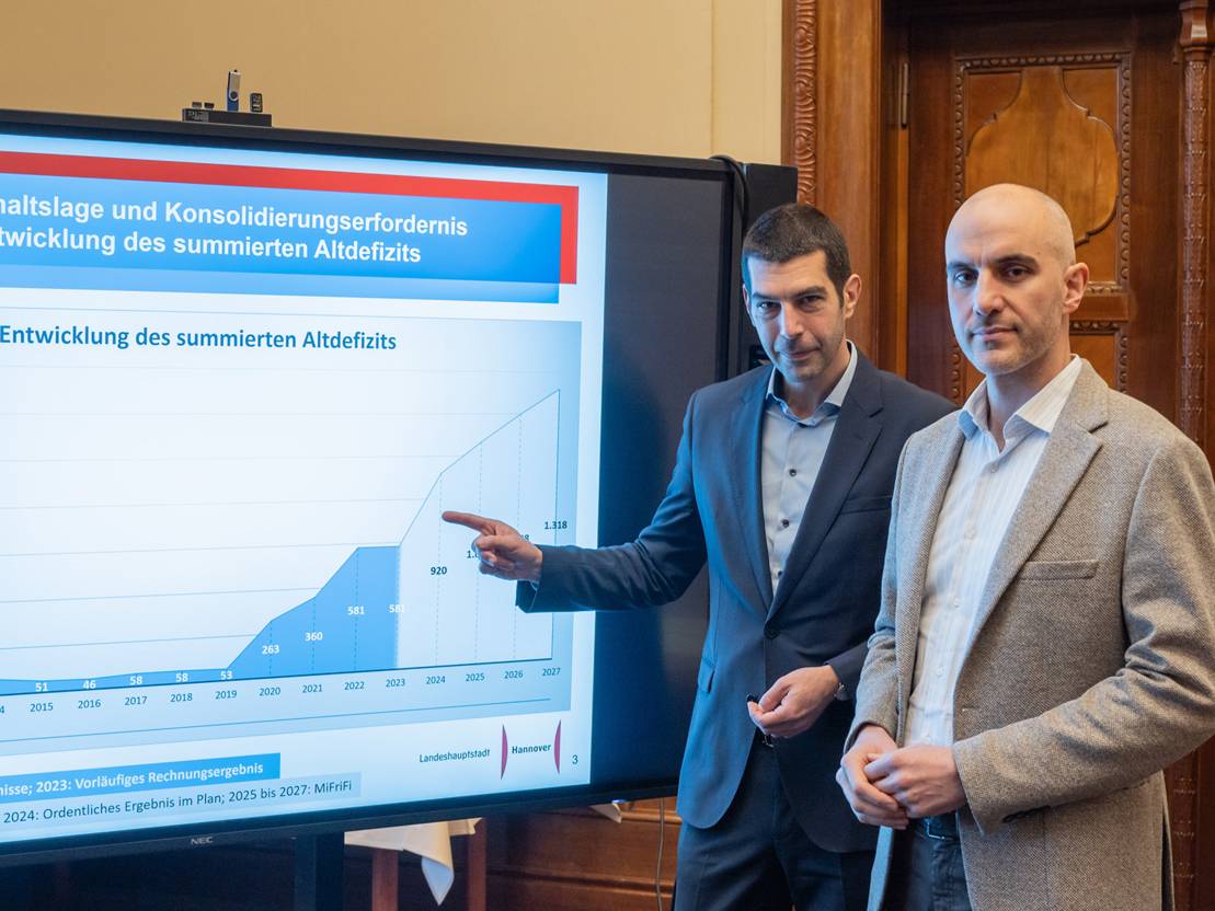 Kämmerer Dr. Axel von der Ohe und Oberbürgermeister Belit Onay stellten die Pläne im Neuen Rathaus vor.