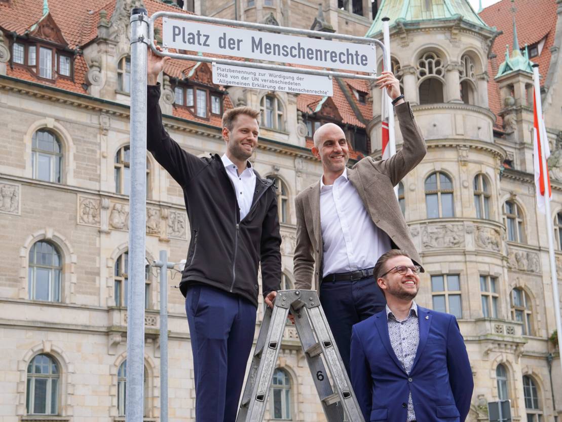 Während des Festaktes wurde offiziell auch das neue Straßenschild enthüllt. „76 Jahre nach der Verkündung der Menschenrechte wollten wir einen öffentlichen Ort in Hannover schaffen, um an diesem zentralen Platz an den Anspruch und die Realisierung der Menschenrechte weltweit zu erinnern“, so Oberbürgermeister Belit Onay.
