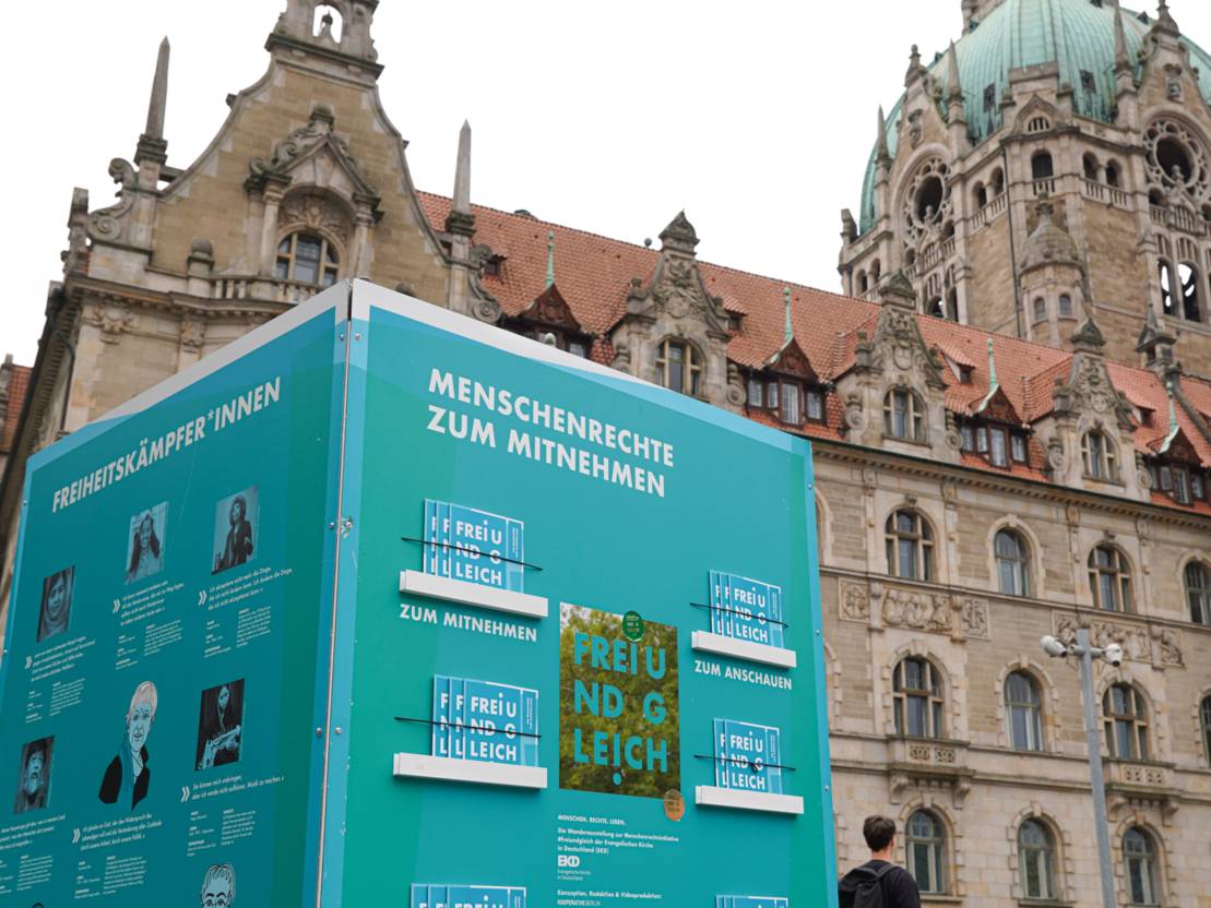 Die Evangelische Kirche Deutschland machte auf dem Platz der Menschenrechte auch auf die neue Ausstellung im Bürgersaal aufmerksam.