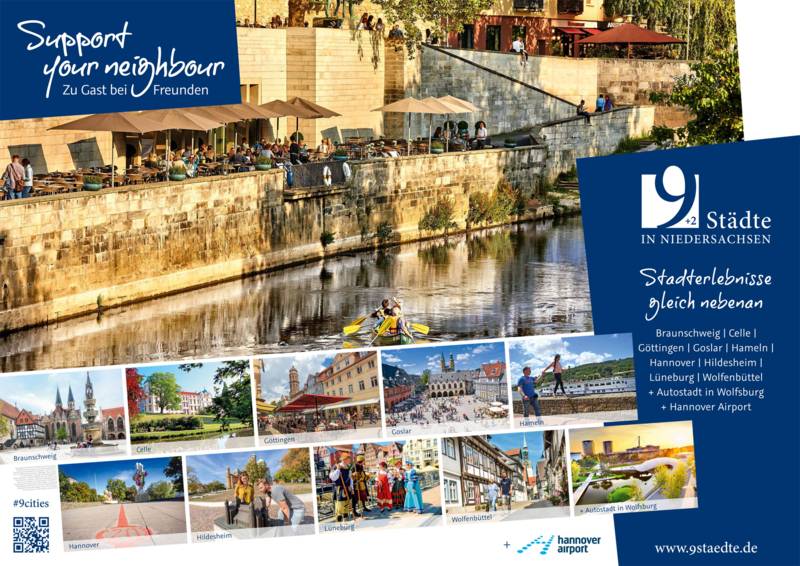 Die Städte Braunschweig, Celle, Göttingen, Goslar, Hameln, Hannover, Hildesheim, Lüneburg, Wolfenbüttel vermarkten sich seit Jahren gemeinsam mit der Autostadt in Wolfsburg und dem Hannover Airport als „9 Städte + 2 in Niedersachsen“ im Ausland. Hauptsächlich aktiv ist die Städtekooperation in den direkten europäischen Nachbarländern. Besondere Zeiten erfordern jedoch besondere Maßnahmen: Aufgrund der Auswirkungen der Corona Pandemie präsentiert sich der Städteverbund ab dem 7. August auch vor der eigenen Haustür, in der Mitte Niedersachsens.
