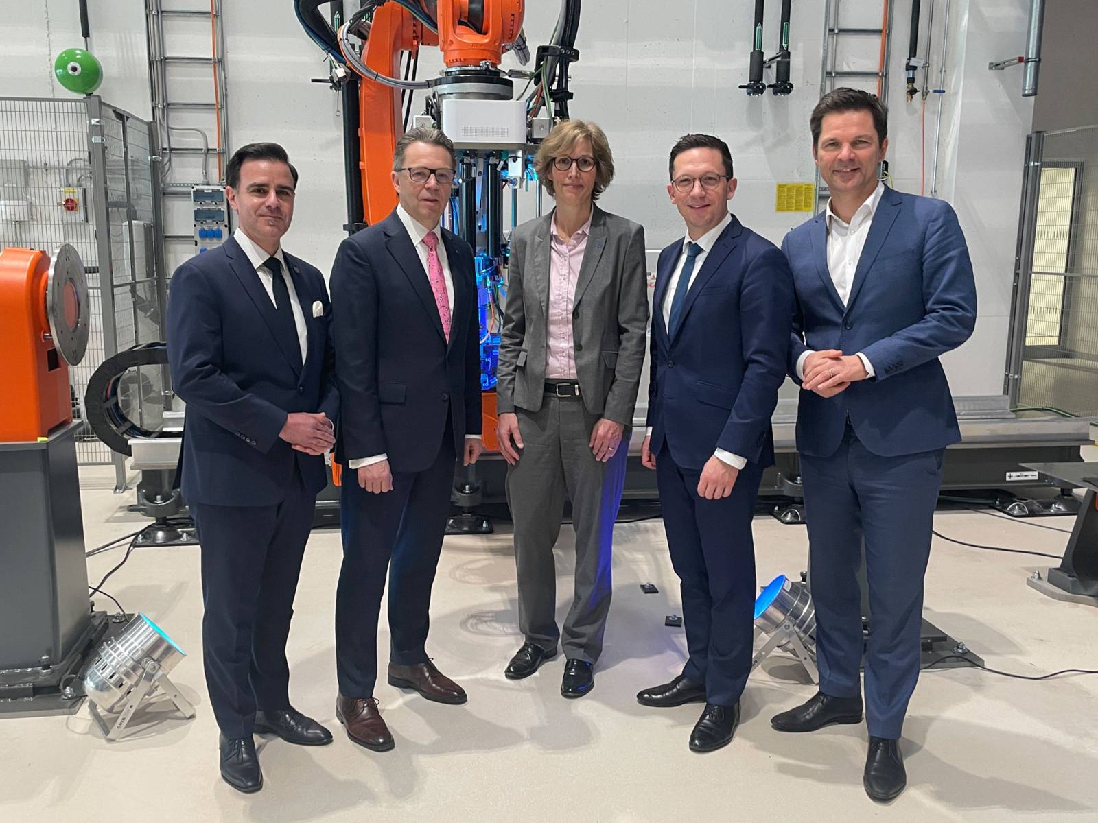 Von links: Claudio Provenzano (Bürgermeister der Stadt Garbsen), Prof. Dr. Volker Epping (Präsident der LUH), Prof. Dr.-Ing. Annika Raatz (Dekanin der Fakultät für Maschinenbau), Falko Mohrs (Niedersächsischer Minister für Wissenschaft und Kultur), Steffen Krach (Regionspräsident der Region Hannover) bei der Eröffnung des Forschungsbaus.