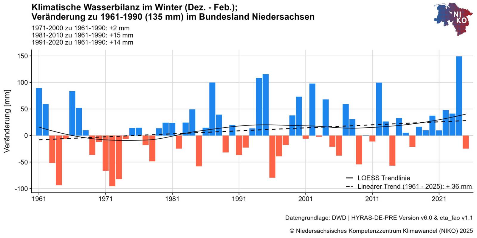 Nach den Erkenntnissen des Landesamtes für Bergbau, Energie und Geologie (LBEG) sind die Bodenspeicher momentan zwar noch ausreichend gefüllt. Doch im Februar und im März gab es viel zu wenig Niederschlag. Laut den Auswertungen des Niedersächsisches Kompetenzzentrums Klimawandel (NIKO), das eng mit dem LBEG zusammenarbeitet, war das niedersächsische Wasserdefizit im März seit Beginn der Wetteraufzeichnungen noch nie so groß. Die sogenannte Klimatische Wasserbilanz betrug -39 Millimeter. Das entspricht einer Fehlmenge von 39 Litern pro Quadratmeter. Die klimatische Wasserbilanz von Dezember 2024 bis Februar 2025 zeigt die geringsten Werte seit 2017.