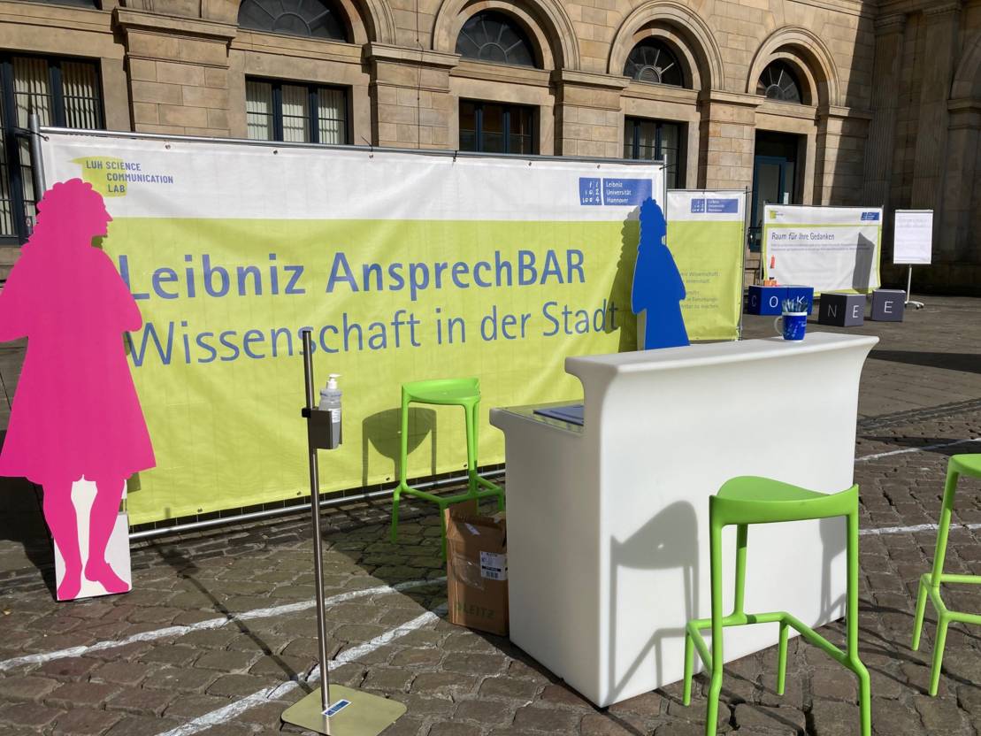 Mit ihrer „LeibnizAnsprechBAR“ stand die Leibniz Universität Hannover bereits seit Montag direkt an der Oper und warb für das Thema Kommunikation von Wissenschaft. Passantinnen und Passanten konnten über Fragen rund um Wissenschaftskommunikation abstimmen, indem sie weiße und blaue Bälle in Gläser warfen. Außerdem konnten Wünsche und Vorschläge zur Wissenschaftskommunikation geäußert werden.