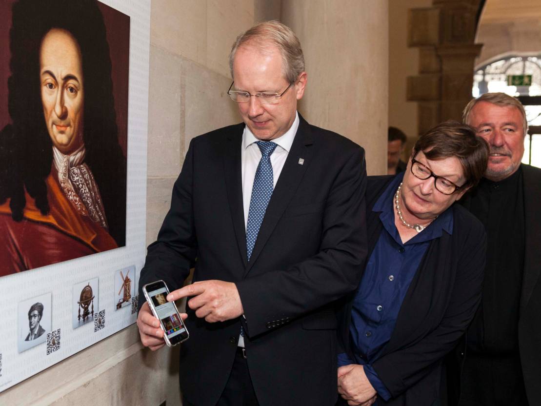 Hannover würdigt Gottfried Wilhelm Leibniz mit einem eigenen Online-Portal: Oberbürgermeister Stefan Schostok scannte als Erster mit seinem Smartphone den QR-Code auf der neuen Leibniz-Tafel im Neuen Rathaus.